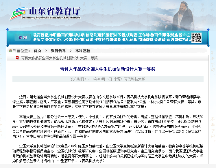 近日,第七届全国大学生机械创新设计大赛决赛在山东交通学院举行,我校必赢线路检测3003no1杨福芹、张泽荣老师指导,谭业成、李艺姗、雷凯、严家全、常新朝五位同学设计制作的参赛作品《“互联网+快…