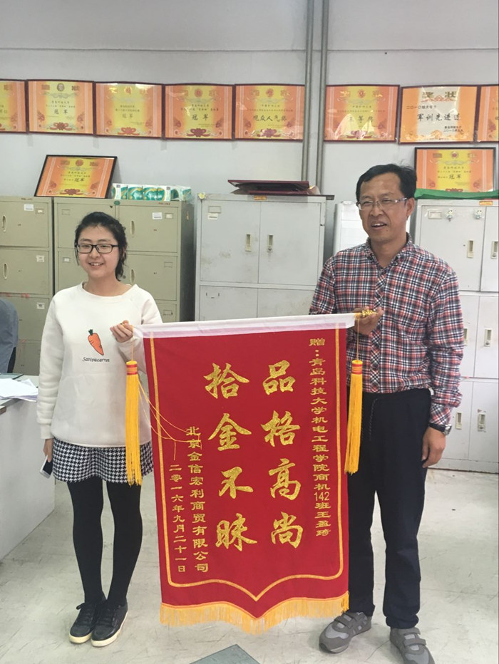 10月13日下午,机电学院收到了北京金信宏利商贸有限公司李金菊赠送的一面锦旗,锦旗上写着“品格高尚,拾金不昧”。