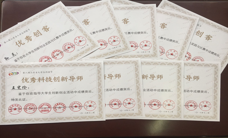 12月16日,第八届山东省大学生科技节闭幕式在山东工艺美院隆重举行。会上表彰了2016年山东省大学生优秀创客、优秀科技创新导师、科技节优秀组织单位。机电学院王宪伦等4名老师获山东省优秀科技创新导师称号,宋宏祥等5名学生获山东省大学生优秀创客称号。