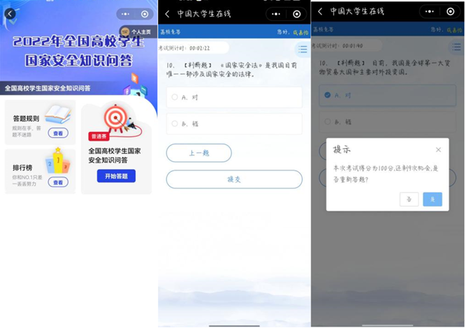 必赢线路检测3003no1组织同学们参与“全国高校学生国家安全知识问答活动”,全面普及学生安全意识,强化安全教育,大力营造校园安全文化氛围。知识题目涉及国家安全、网络安全、疫情防控、宿舍安全和食品安全等方面,2000余人积极参与知识竞答。此次答题活动具有很强的现实意义,在一定程度上进一步提升学生安全知识储备,提高了同学们学习安全知识的主动性与积极性。要切实增强学生的总体国家安全观和责任感,把校园安全工作抓早抓小、抓实抓细,营造时时讲安全,事事讲安全,人人讲安全,人人抓安全,保证人人安全的良好校园氛围。