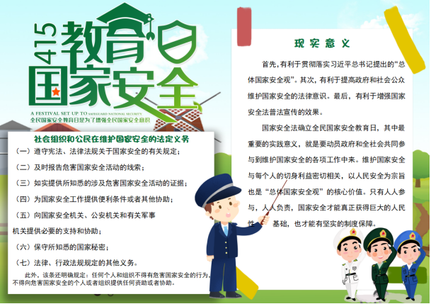 为广泛宣传习近平新时代中国特色社会主义思想和总体国家安全观,增强学生国家安全意识和责任感,机电工程工程学院组织集体观看国家安全教育系列片——《国安天下宁》,同学们认真学习并写下了深刻感悟。学院学生踊跃参加国家安全教育海报设计制作活动,累计制作海报30份,为国家安全日的到来营造浓厚教育宣传氛围。机械211班高士博同学说:“国家安全无小事,维护国家安全重要而又紧迫。作为新时代的接班人应积极主动接受国家安全教育,掌握安全知识、增强国家安全意识、树立国家安全观。不管是在学习生活还是疫情防控中,要牢牢把握大局意识,维护国家安全利益,用实际行动履行维护国家安全的义务。”