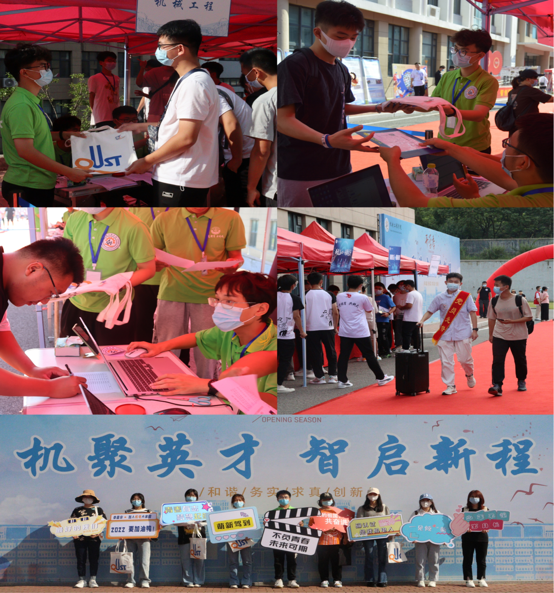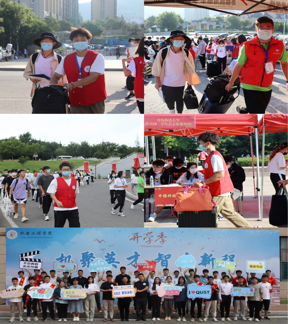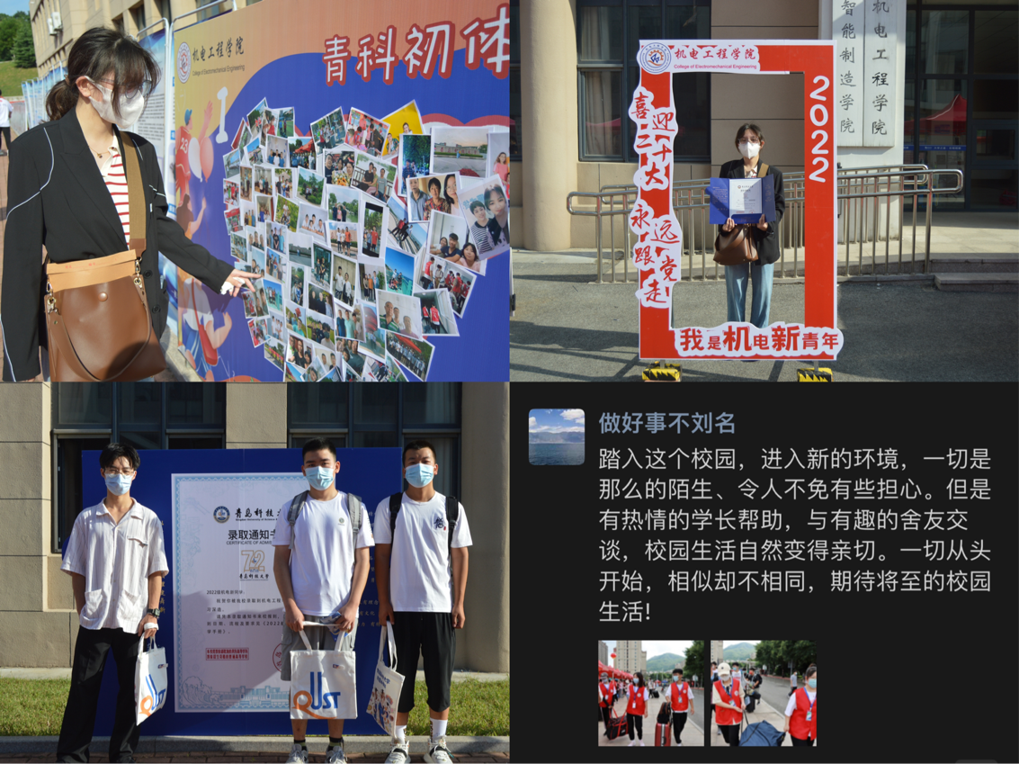 学院坚持守正创新,分工协同,热心服务,把方便留给新生,把满意留给家长。学院志愿者在开学完成新生100%对接,建立2022级官方新生年级群、专业群、班级群,就校园布局、学业课程、科大美食、周边环境等进行介绍答疑。在入学前详细摸排学生健康码、行程码、核酸检测证明、所在地疫情等信息,每日收集更新新增疫情地点和场所,在学院群和班级群中发布疫情防控期间的入校温馨提示,全力保证入校新生符合疫情防控政策规定。报到当天,学院在迎新工作点设置“党员先锋岗”“绿色通道”“志愿服务亭”等,为新生现场引导答疑。学院的迎新志愿者奔走在校园的各个角落,为新生指引方向,协助新生搬运行李,帮助新生完成报到手续,全面推动志愿服务实现新提升。每一名志愿者用饱满的热情、踏实的行动和对志愿服务精神的坚守彰显了机电学子的青春风采,践行了新时代大学生的责任担当。
