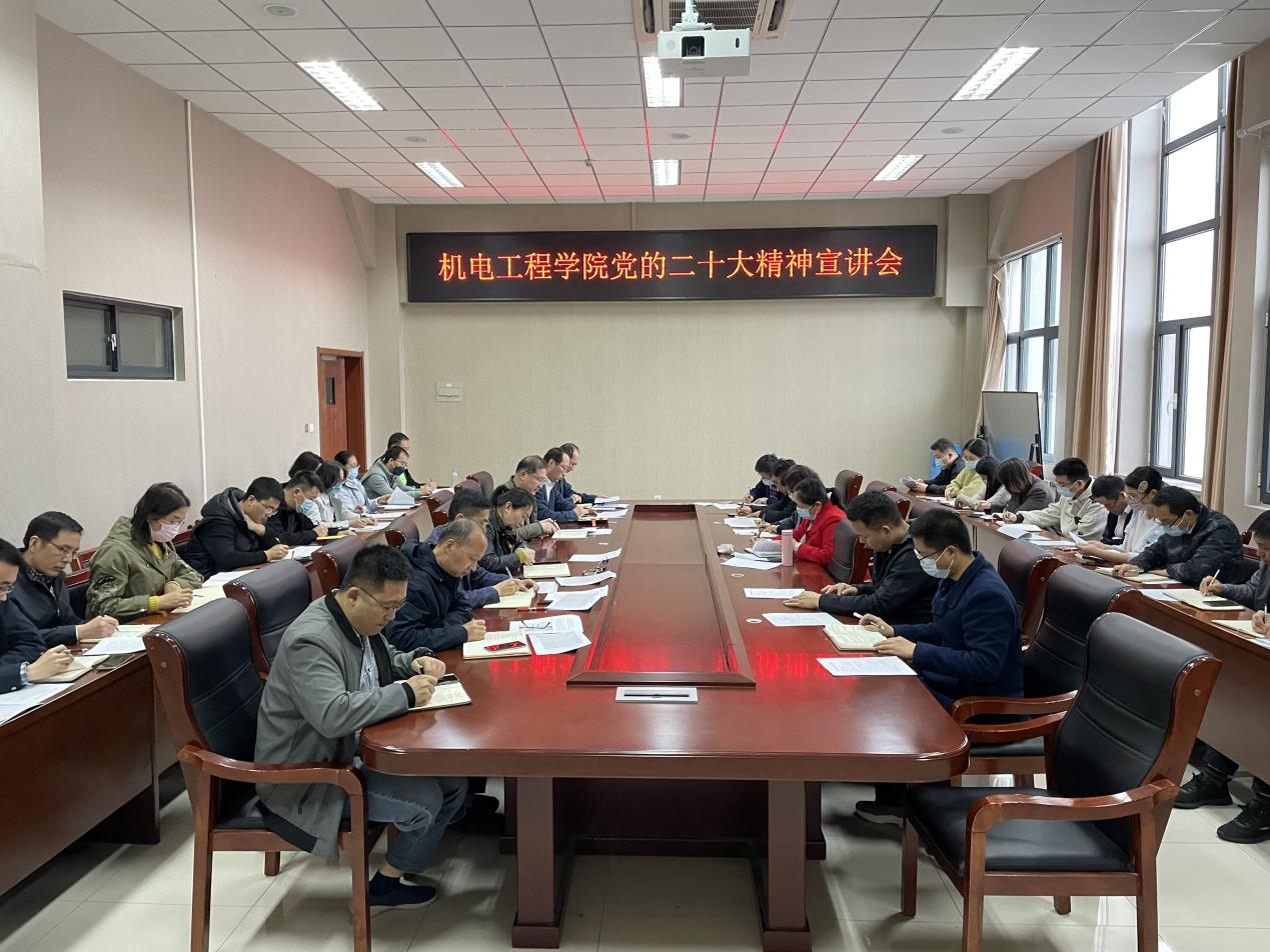 宣讲结束后,各党支部分别召开专题学习会议,党支部书记开展宣讲。机电学院党委将通过“书记第一讲”、党的二十大代表作报告等丰富多彩的形式不断推动党的二十大精神入脑入心、见行见效,引导广大党员把学习党的二十大精神与做好当下工作、谋划好明年工作结合起来,做到学思用贯通、知信行统一,努力为全面建设社会主义现代化国家、全面推进中华民族伟大复兴贡献应有的力量。