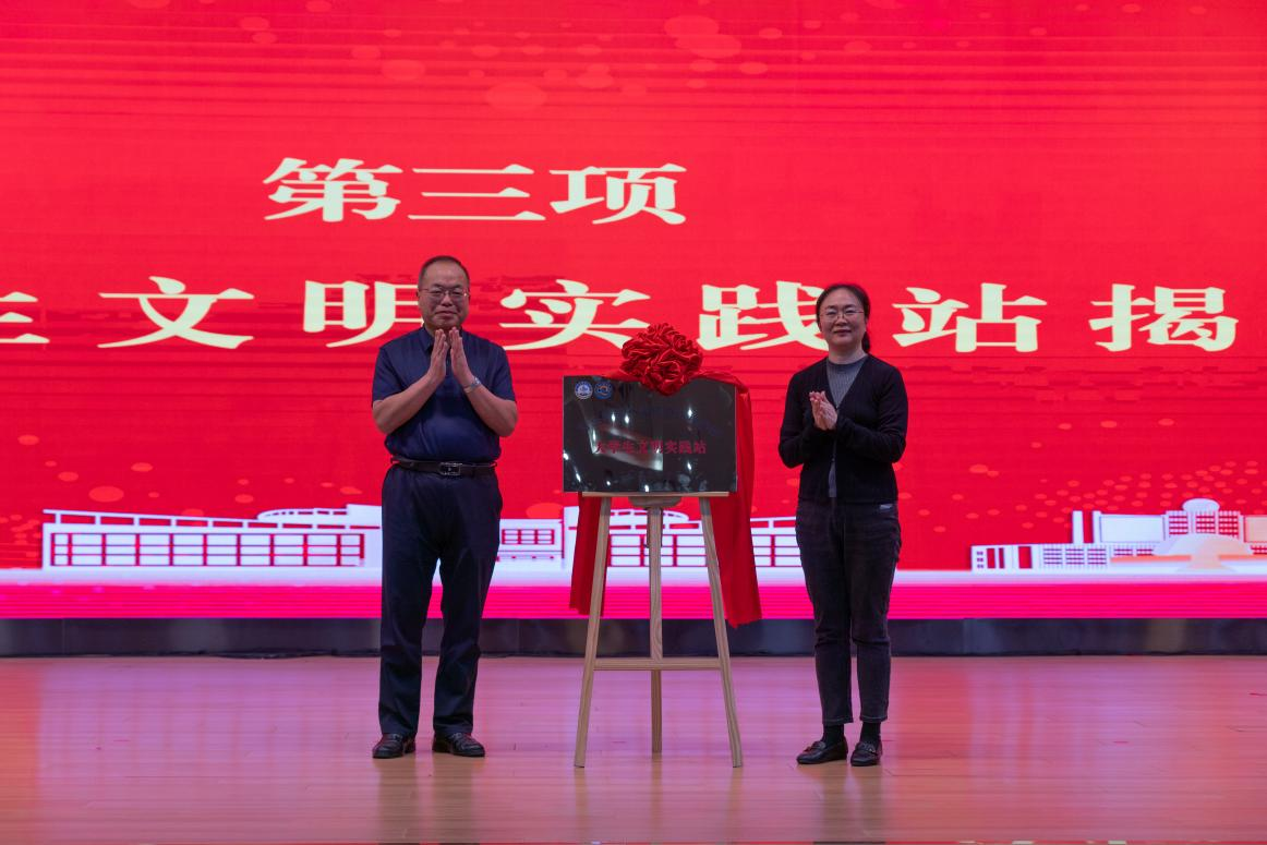 学校党委常委、副校长丁林与必赢线路检测3003no1院长何燕为学院大学生文明实践站揭牌。