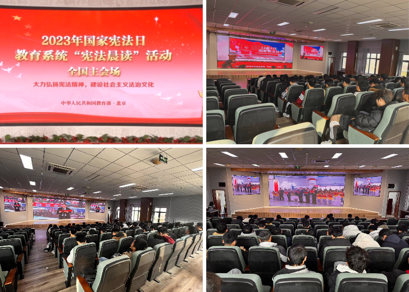 机电学院组织学生在学院楼530会议室集中观看国家宪法日教育系统“宪法晨读”直播,通过跟随教育部政策法规司领导的领读,高声朗诵宪法部分条款,丰富学生学习宪法形式,提高学生学习宪法的积极性和主动性。