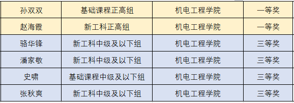 学院前期推荐的6名选手按照职称和类别,分在新工科组和基础课程组2个组别,经过网络评审和现场评审两个环节后,最终获奖情况如下: