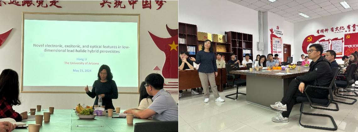 5月23日,美国亚利桑那大学化学与生物学院Li Hong教授受邀莅临必赢线路检测3003no1,开展题为“低维铅-卤化物杂化过氧化物中的新型电子、激子和光学特征”的学术报告。山东大学的李元老师、吉林大学的王同辉老师,青科机电新能源科学与工程系的刘治明、王晓君、白文娟、楚电明、李建伟、王雨霄和李慧芳等老师,以及能源动力工程专业的部分研究生到场听取了本次报告。