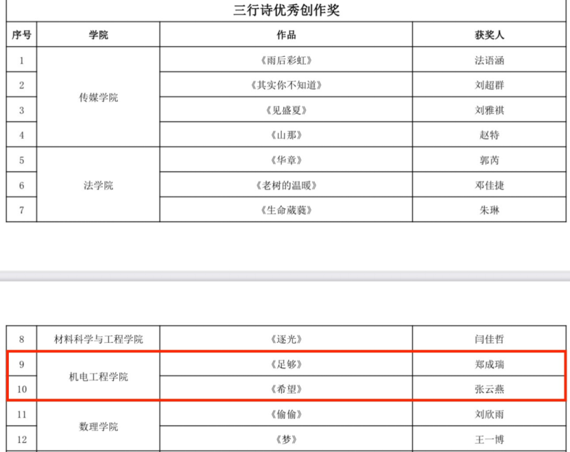 《“小卷的人生翻盘”剧本杀团辅活动》获评心理健康教育特色活动;由王晓政提报的《以读书之效,拓内心》和由张云燕、赵冉提报的《心理班会,快乐成长-小游戏版》获评“优秀主题班会”;由郑成瑞提报的《足够》和张云燕提报的《希望》获评“三行诗优秀创作奖”。