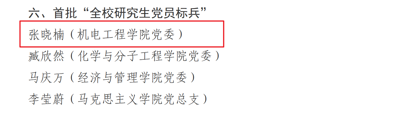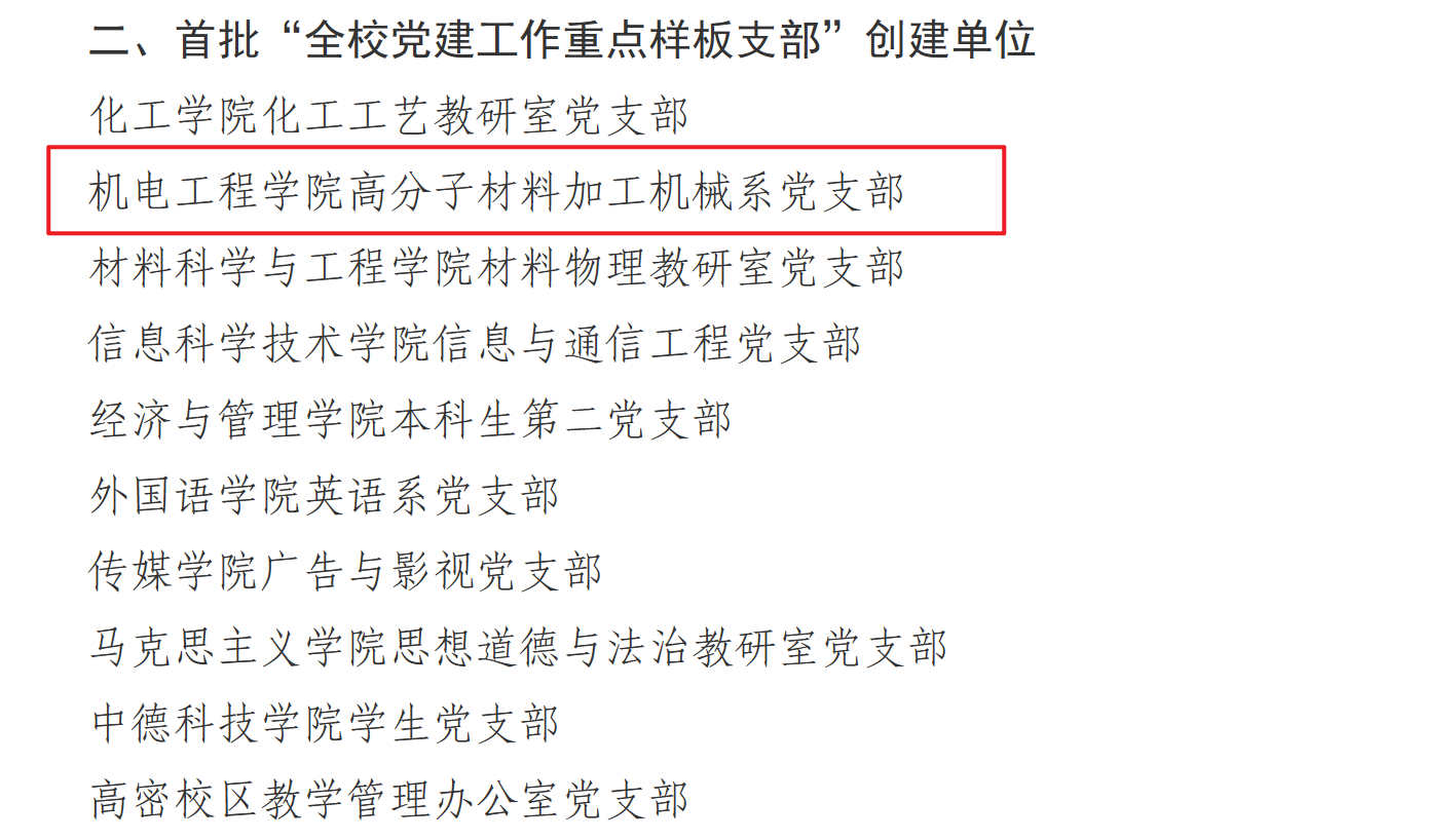必赢线路检测3003no1党委荣获多项佳绩,其中,学院党委入选首批“全校党建工作标杆院系”创建单位,高分子材料加工机械系党支部入选首批“全校党建工作重点样板支部”创建单位,机械工程及自动化系党支部书记工作室入选首批“全校‘双带头人’教师党支部书记工作室”创建单位,2022级硕士研究生张晓楠入选首批“全校研究生党员标兵”。