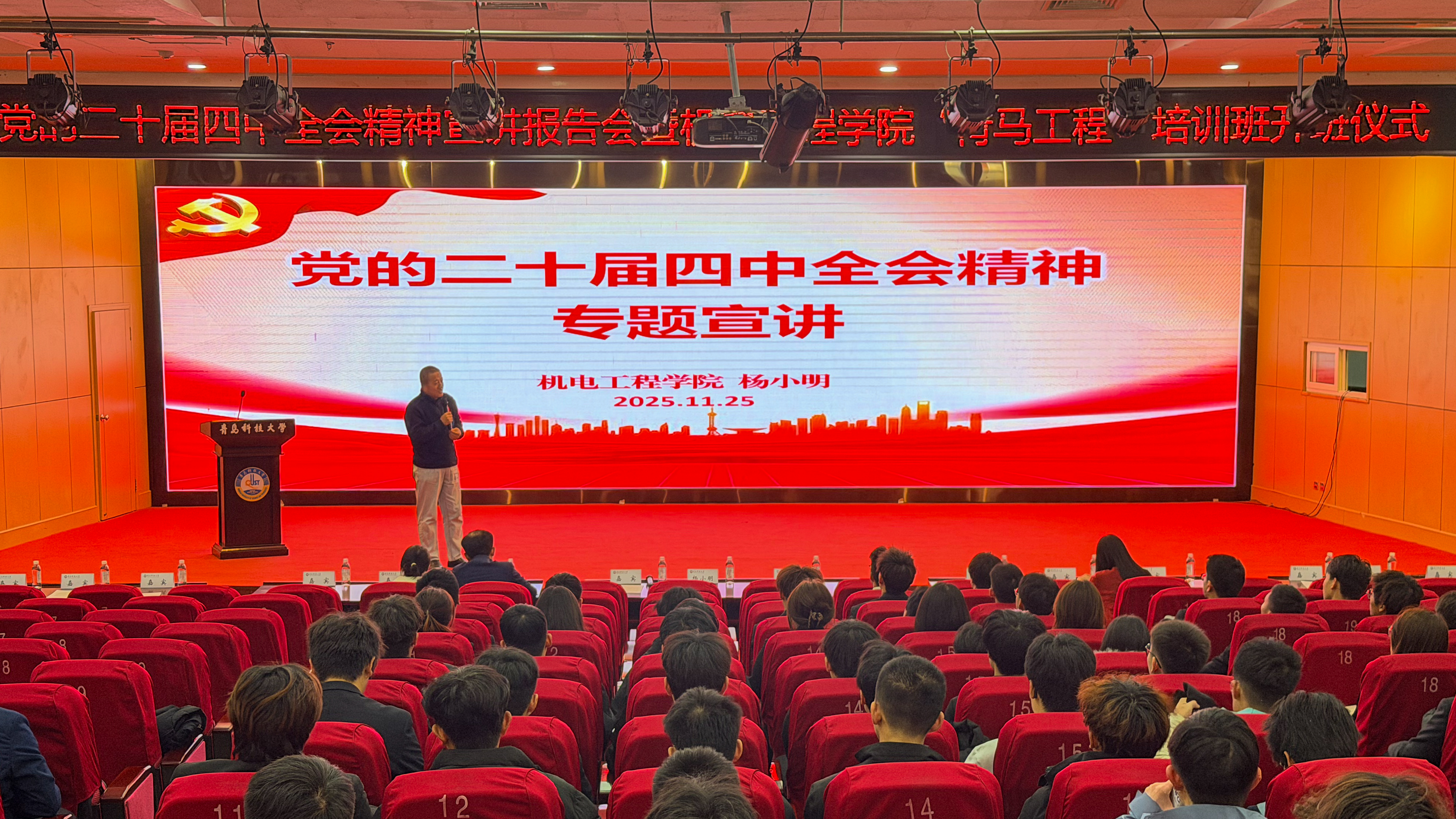 为深入学习贯彻党的二十届四中全会精神,扎实推进青年马克思主义者培养工作,必赢线路检测3003no1于11月25日举办党的二十届四中全会精神宣讲报告会暨2025-2026学年“青马工程”培训班开班仪式。必赢线路检测3003no1党委副书记兼副院长杨小明以及学院全体专兼职团干部,青马工程培训班学员、团校学员代表参与本次会议。开班仪式由学院团委副书记李慧敏主持。