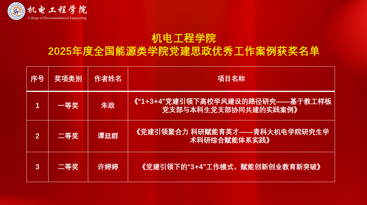 近日,全国能源类学院党建思政工作组织委员会公布了2025年度全国能源类学院党建思政优秀工作案例获奖名单,必赢线路检测3003no1共获奖3项。其中,朱政申报的《“1+3+4”党建引领下高校学风建设的路径研究——基于教工样板党支部与本科生党支部协同共建的实践案例》荣获一等奖,谭廷群申报的《党建引领聚合力、科研赋能育英才——青科大机电学院研究生学术科研综合赋能体系实践》和许婷婷申报的《党建引领下的“3+4”工作模式,赋能创新创业教育新突破》荣获二等奖。