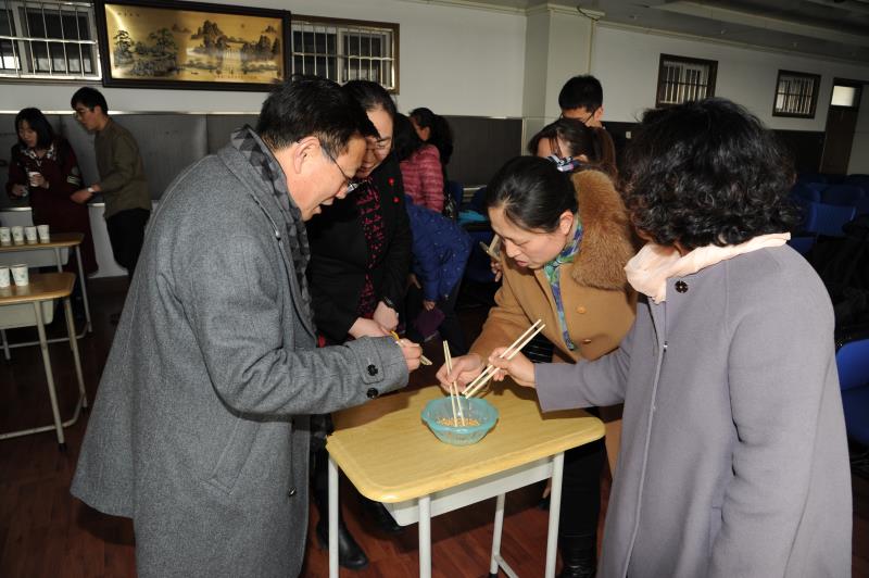 活动分为两个环节分别是“吹乒乓球”和“夹黄豆”比赛,在“吹乒乓球”的比赛中老师们用嘴将乒乓球从1纸杯依次吹到5纸杯,用时最少的获胜。而“夹黄豆”比赛则是在一盘放置若干黄豆,在1min内用筷子将黄豆从一盘夹至另一盘,比赛结束后B盘中黄豆多者胜。大家在一片欢声笑语中结束了活动,获得了难得的节日享受。