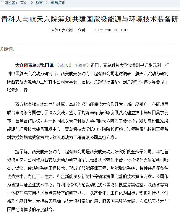 【大众网】青科大与航天六院筹划共建国家级能源与环境技术装备研究中心