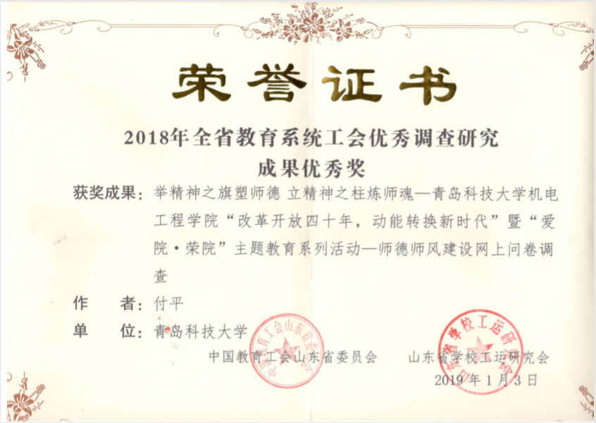 近日,机电学院分工会付平老师结合我院工会工作实际,所申报的《举精神之旗塑师德 立精神支柱炼师魂---必赢线路检测3003no1“改革开放四十周年,动能转换新时代”暨“爱院·荣院”主题教育系列活动---师德师风建设网上问卷调查》在全省100多项作品中脱颖而出,获得2018年全省教育系统工会优秀调查研究成果优秀奖。