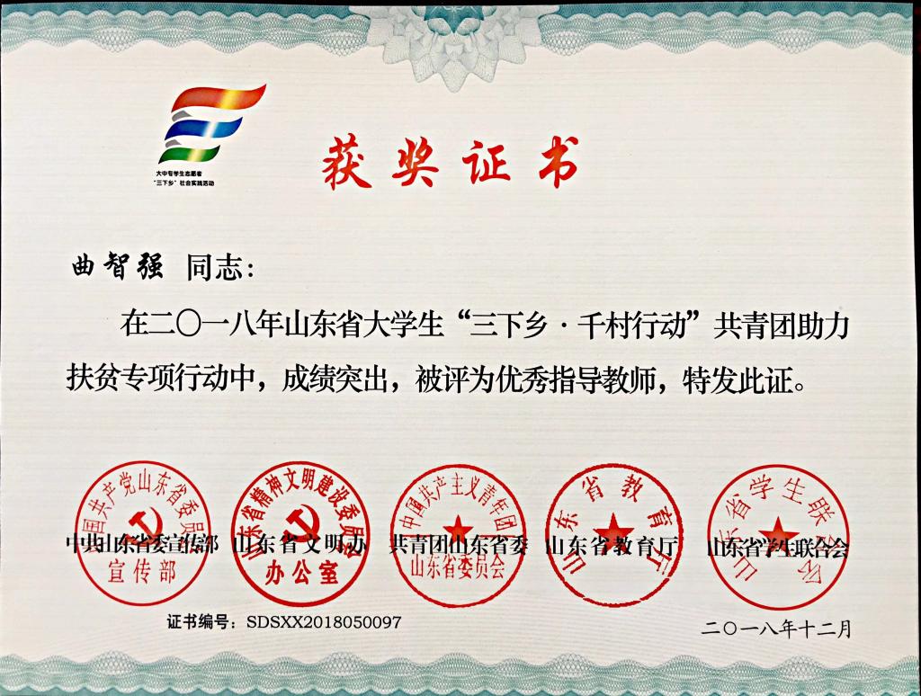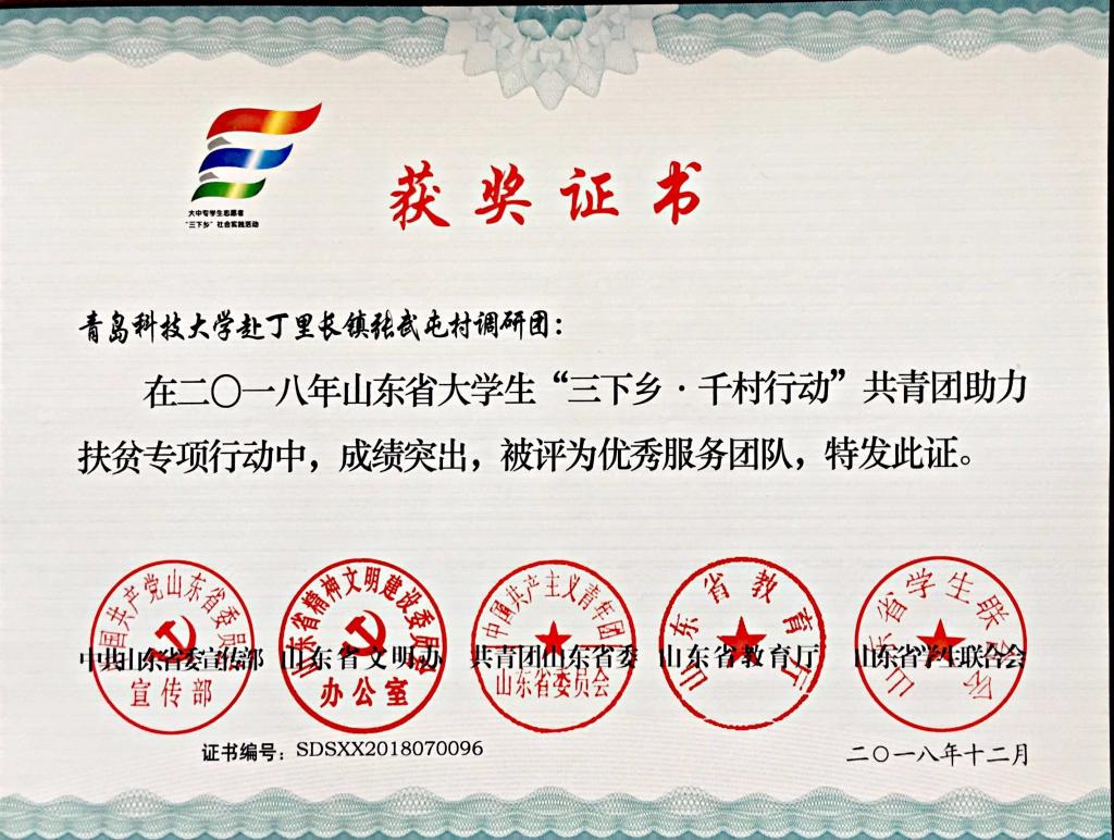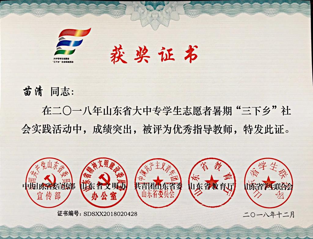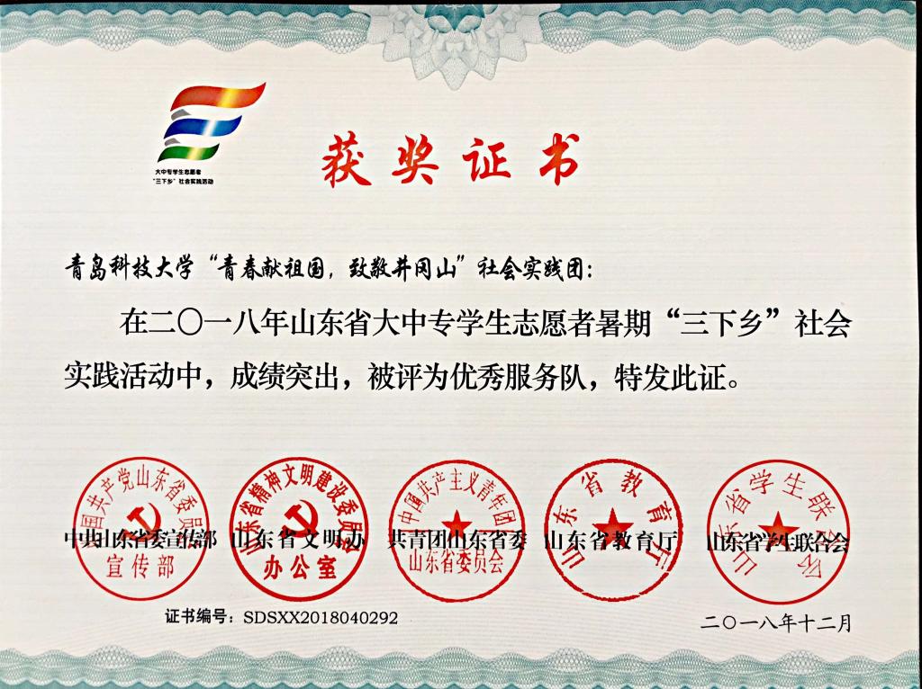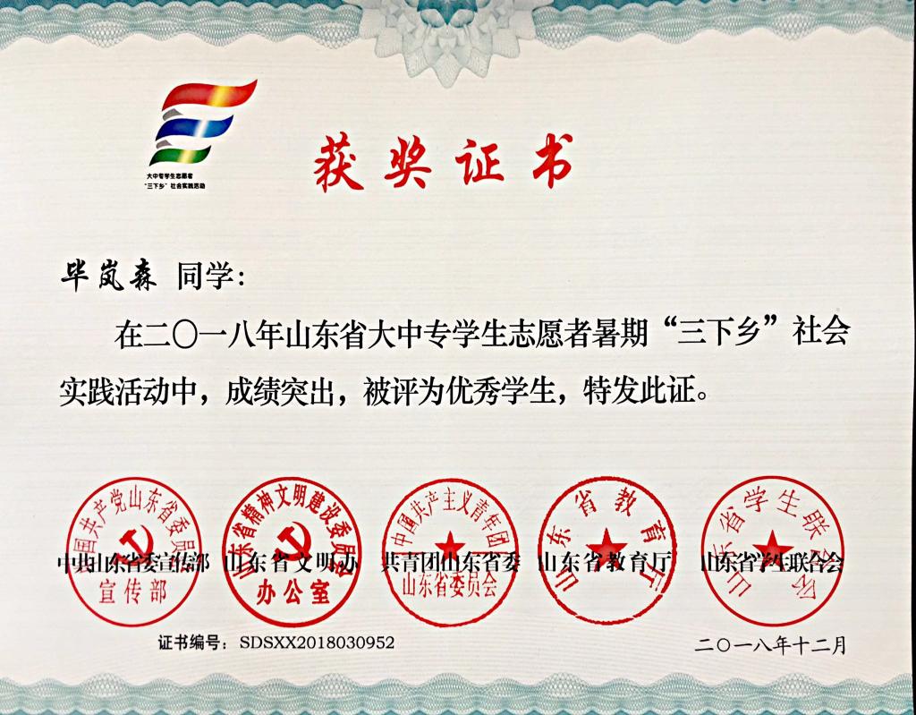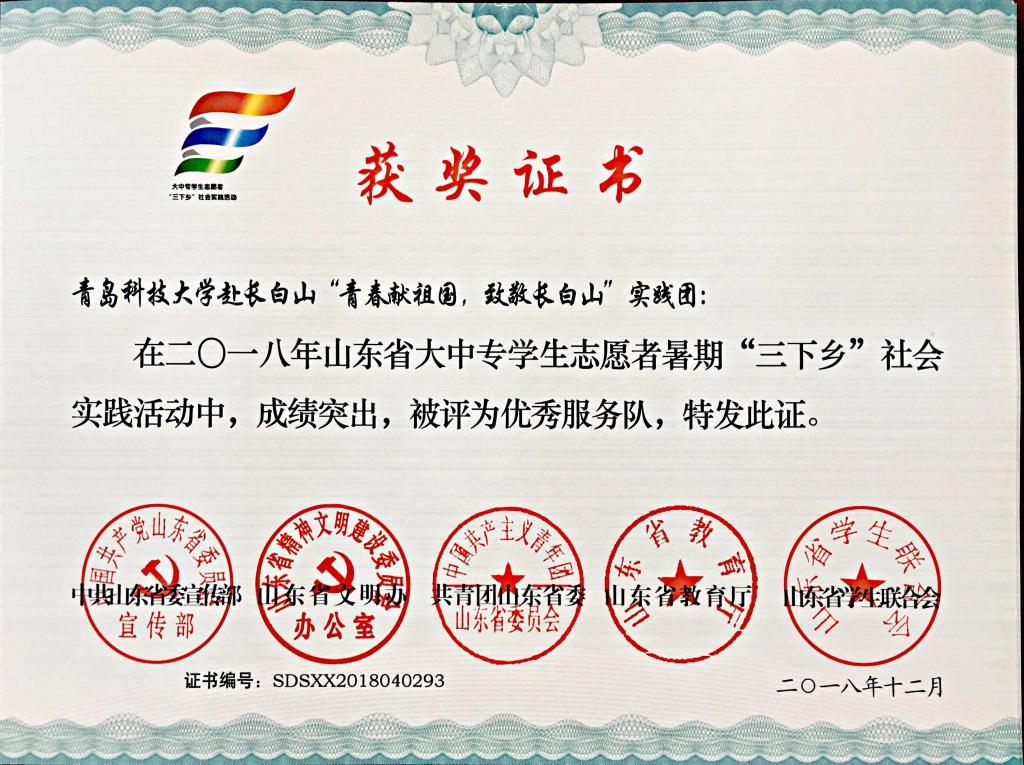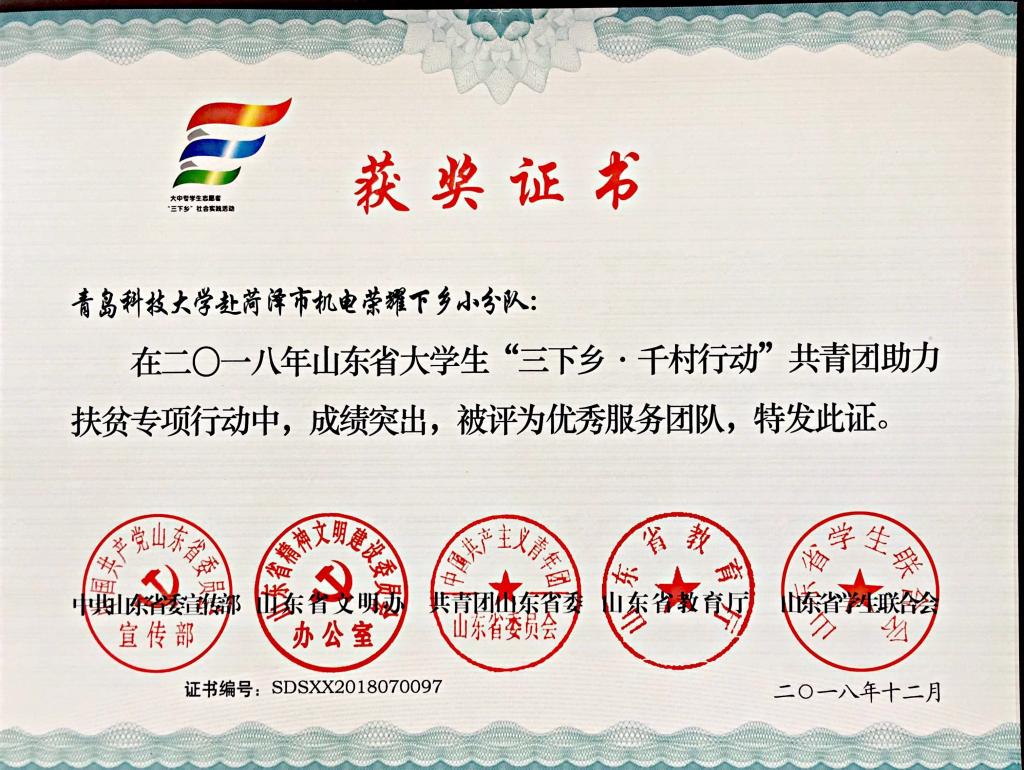 近日,2018年山东省大中专学生志愿者暑期文化科技卫生“三下乡”社会实践活动先进集体和先进个人的证书下发,机电学院“必赢线路检测3003no1赴长白山‘青春献祖国 致敬长白山’实践团” “必赢线路检测3003no1赴长白山‘青春献祖国 致敬井冈山’实践团”获“三下乡”社会实践省级优秀服务队, “必赢线路检测3003no1赴菏泽市机电荣耀下乡小分队”、“必赢线路检测3003no1赴丁里长镇张武屯村调研团”获“三下乡·千村行动”共青团助力扶贫专项行动省级优秀服务团队,曲智强、李东阳获 “三下乡·千村行动”共青团助力扶贫专项行动社会实践活动优秀指导教师,王娟娟、苗清获“三下乡”社会实践活动优秀指导教师,毕岚森等多名学生获 “三下乡”社会实践优秀学生。