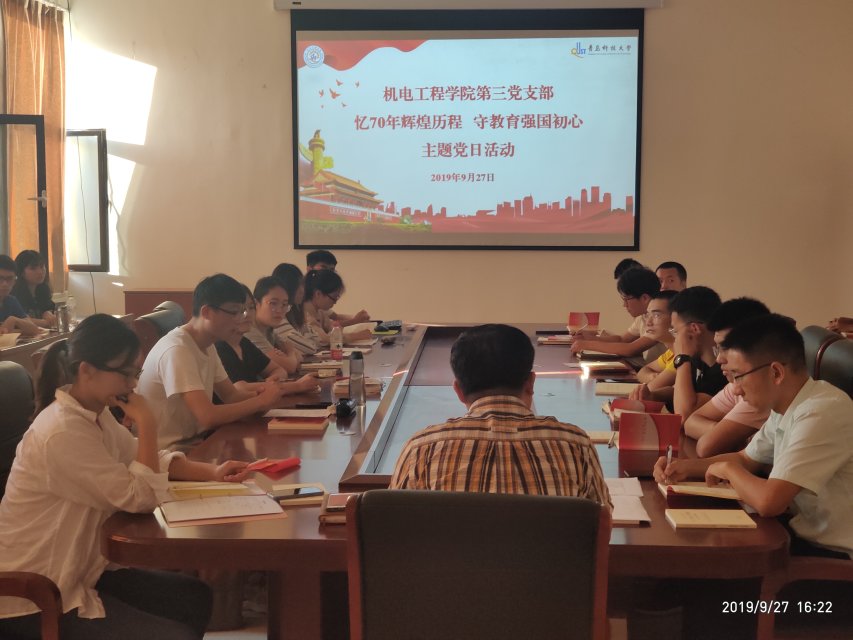 为贯彻必赢线路检测3003no1召开“不忘初心、牢记使命”主题教育工作会议精神、贯彻校组织部关于党支部组织生活指导意见,在中华人民共和国成立70周年到来之际,充分发挥党员的榜样示范作用,营造爱国氛围、凝聚奋进力量,引领广大师生继承和发扬爱国主义精神,不断提升党的凝聚力和引领力。9月27日,必赢线路检测3003no1第三党支部在机电学院518会议室举行“忆70年辉煌历程 守教育强国初心”主题党日活动。第三党支部全体党员参加了活动,活动由党支部书记王作辉主持。