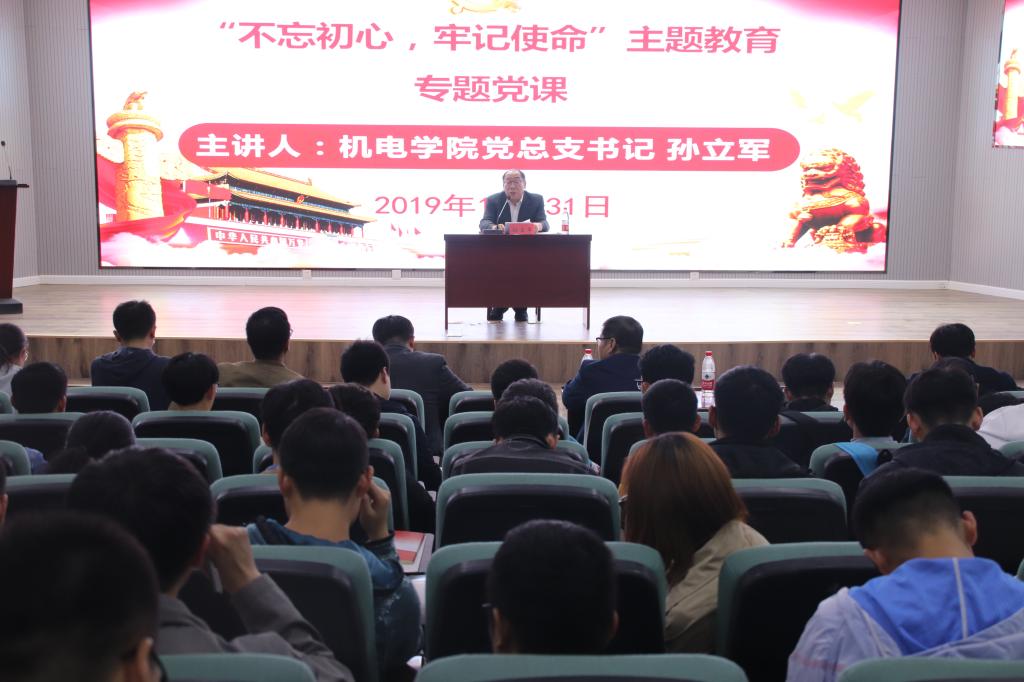 为深入推进“不忘初心、牢记使命”主题教育工作,不断解放思想、把握办学规律、激发奋进动力,10月31日晚,机电学院党总支书记孙立军为机电学院全体学生党员上了题为《践行党的宗旨,做党和人民满意的好党员、好干部》的“不忘初心、牢记使命”主题教育专题党课。校纪委史勤芳出席了党课,机电学院党总支副书记兼副院长王伟及全体专兼职辅导员、全体学生党员参加了党课学习,党课由学院分团委书记王作辉主持。