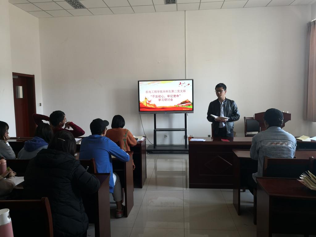 为不断推动主题教育入心入脑,深入学习贯彻习近平新时代中国特色社会主义思想,不断坚定广大学生党员的理想信念,11月8日中午,机电学院本科生第二党支部开展“不忘初心、牢记使命”主题教育集中学习研讨会,全体党支部党员参加了学习研讨,党支部书记曲智强主持学习研讨会。