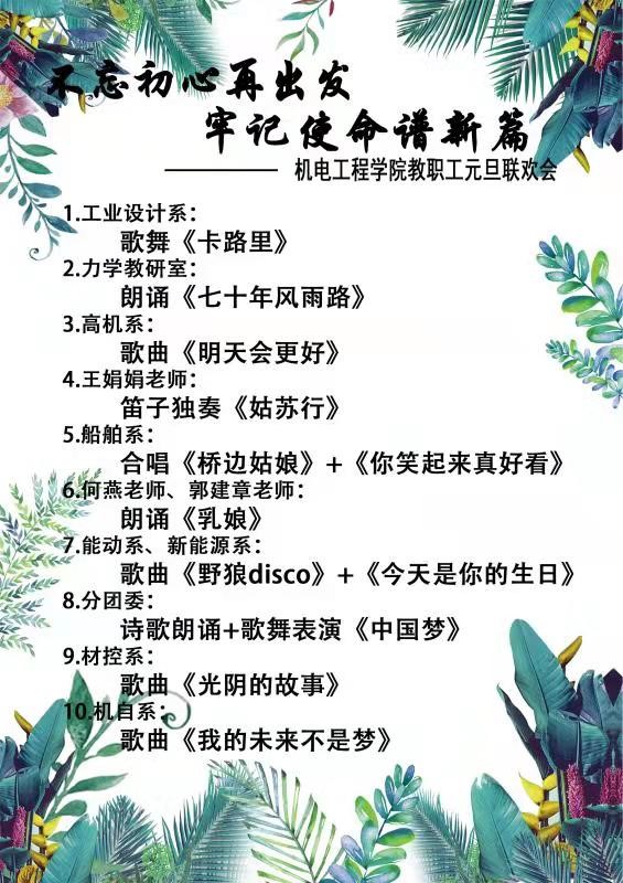 这场联欢会不仅传递了机电人对新年的祝福、对机电学院的祝福,更多的展现了机电教职工的才艺,让所有老师感受到了机电大家庭的热情与温馨。元旦联欢会的圆满举行也代表了机电学院全体教职工将共同携手以饱满的热情创造机电学院更美好的明天!