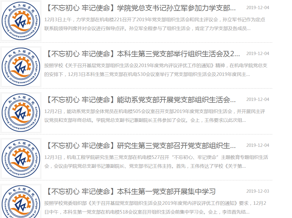 一年来,学院坚持讲好机电故事,发好机电声音。全年共发新闻超400篇,其中科大要闻5篇, 综合新闻31篇。日常投稿4篇,“不忘初心、牢记使命”主题教育投稿31篇。学院网站机电266篇,学生工作82篇。学生处网站学院传真投稿12篇。新工科、王跃熙、暑期社会实践等获得市级及以上媒体报道22次。