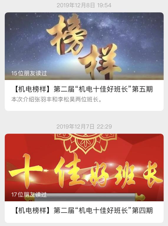 榜样传承精神,先进典型是有形的正能量,也是鲜活的价值观。学院设立“榜Young”系列,宣传了“中国好人”王跃熙、“大智之星”王敏、优秀机电学子刘冰桀等,让机电学子汲取榜样“内在的力量”,向榜样看齐。制作“机电好班长”、“十佳团支书”等专题,让机电学生班干等像榜样看齐,争做合格学生干部。推出“百团百优”栏目,推出150余个班团剪影,增强班级凝聚力。