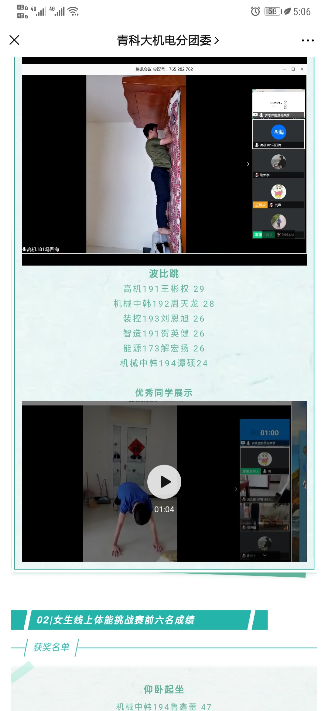 为了响应山东省教育厅和学校关于“线上教育要重视学生心理健康”的工作要求,帮助学生缓解焦虑情绪,活跃学生居家锻炼氛围,机电学院举办了“莘莘学子共庆七十华诞,矫健英姿同战疫疠瘟情”线上体能挑战赛。比赛分男子组和女子组,男子组项目有一分钟俯卧撑、一分钟波比跳、平板支撑;女子组项目有一分钟仰卧起坐、一分钟开合跳、平板支撑,活动中,选手们在家运动,线上比赛,不断强健学子体魄。