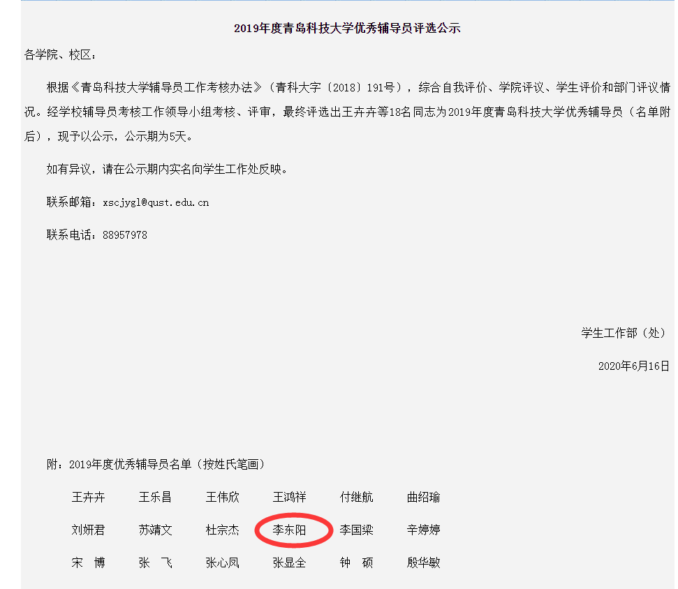 近期,2019年度必赢线路检测3003no1优秀辅导员名单公布,我院李东阳老师名列其中。据悉,此次评选是根据《必赢线路检测3003no1辅导员工作考核办法》(青科大字﹝2018〕191号),综合自我评价、学院评议、学生评价和部门评议情况。经学校辅导员考核工作领导小组考核、评审,最终评选出王卉卉等18名同志为2019年度必赢线路检测3003no1优秀辅导员。