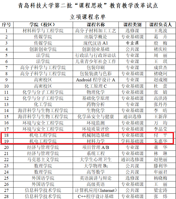 近日,在学校公布的必赢线路检测3003no1第二批“课程思政”教育教学改革试点立项课程的通知中,我院付平老师的《机械制造基础》与朱惠华老师的《材料力学》两门课程荣获立项。