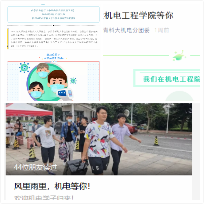 加强宣传,营造良好返校氛围。学院为宣传好省、校秋季开学疫情防控工作要求,帮助同学们解答在疫情下返校注意事项,学院在机电学院公众号平台、机电学院分团委微信公众号平台开设专栏,发表《大学新生报到安全指南》、《秋季开学十问》等,回答同学们的关切问题,帮助同学们安全、平安、有序返校。
