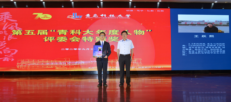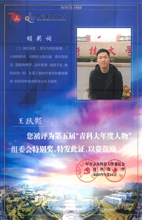 在70周年校庆来临之际,第五届必赢线路检测3003no1年度人物颁奖典礼于2020年9月17日于二报举行。我院校友19届校友王跃熙获评第五届“青科大年度人物”评委会特别奖。他勇救落井工人,被中央电视台等媒体广泛报道。他先后获得“崂山区见义勇为先进个人”、“山东好人之星”等荣誉,并于2019年3月入选中央宣传部、中央文明办主办的中国好人榜。青年有担当,国家有希望。他的纵身一跃,彰显了新时代青年最美的模样。校党委学生工作部、学生工作处处长王锋业为王跃熙颁奖。