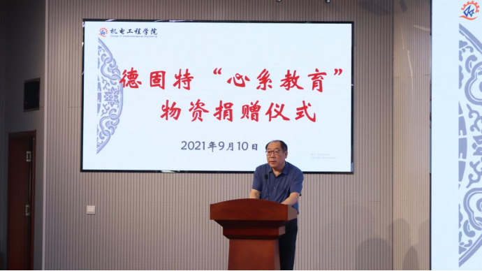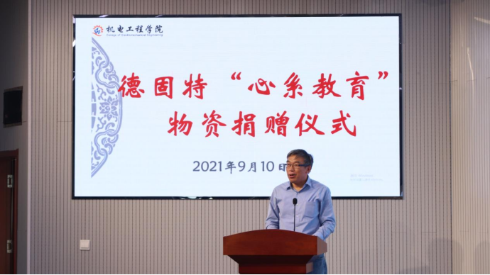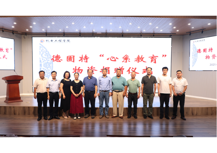 9月10日,适逢第37个教师节,机电学院举办德固特“心系教育”物资捐赠仪式。青岛德固特节能装备股份有限公司董事长魏振文、副总经理崔建波、研发部部长金延超、综合部部长李红娟、学校原党委副书记张元利、必赢线路检测3003no1党委书记孙立军、院长何燕及教师代表参加活动。