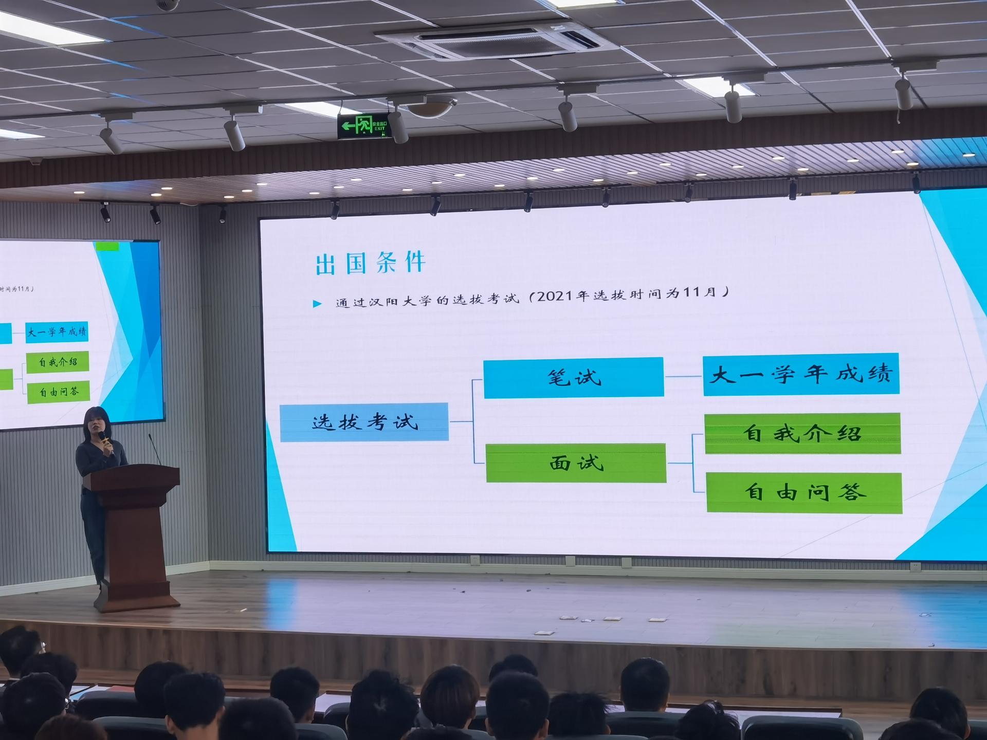 林奕从项目基本情况、出国条件、选拔过程、历年来中韩专业出国情况以及出国规划进行详细介绍,通过视频及PPT的形式帮助同学们更好更快的了解汉阳大学的相关情况,让同学们更直观的感受到了汉阳大学的不同,更好的了解了中韩专业的特性特点,为同学们的未来道路规划提供新思路,明确新方向。