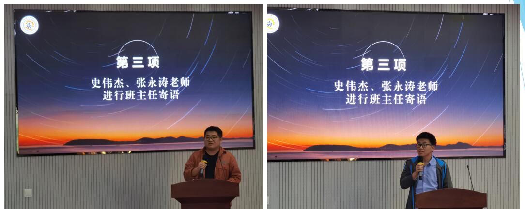 史伟杰、张永涛寄语同学们:一要勇于担当,不怕困难;二要践行品格,求真务实;三要激发动力,勇于创新。通过生动形象的例子,为同学们答疑解惑,指点迷津;期望同学们不断历练,不断成长、德才兼备、学以成人,成为德智体美劳全面发展的社会主义合格建设者和可靠接班人。