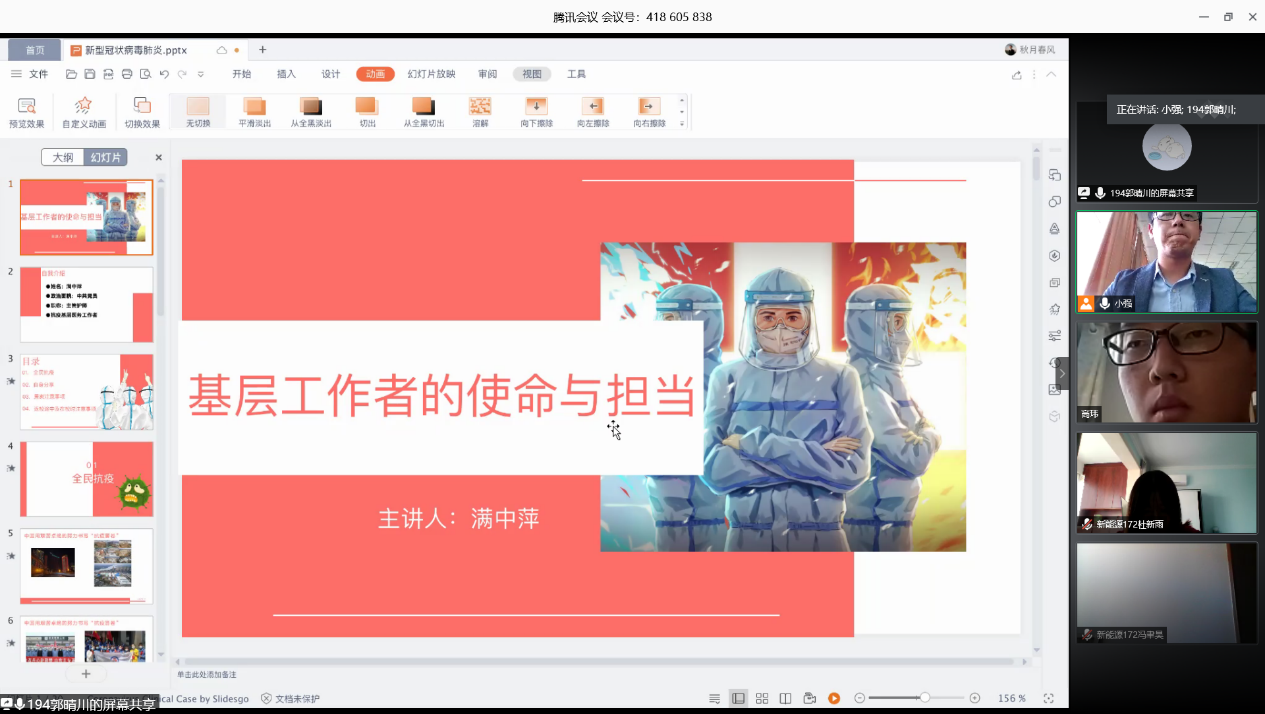 会上,首先由满中萍同志分享了她在疫情期间的抗疫经历和感受,满中萍同志作为一名党员不畏艰难、冲锋在前、能吃苦、勇于担当的精神令全体党员动容,同时,该同志也分享了疫情在家和返校时的一些注意事项,指出要严于律己,保护自己和他人。分享过后与支部党员进行了短暂交流,大家收获颇丰。