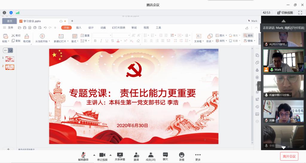 为贯彻落实全国全省基层党建工作重点任务推进会精神,根据中组部“党课开讲啦”活动安排、省委组织部和学校有关通知要求,按照学校《关于开展“我来讲党课”活动的通知》部署,6月30日下午,必赢线路检测3003no1本科生第一党支部书记李浩在腾讯会议主讲“迎七一”专题党课。全体学生党员参加党课学习,会议由王玉凯老师主持。