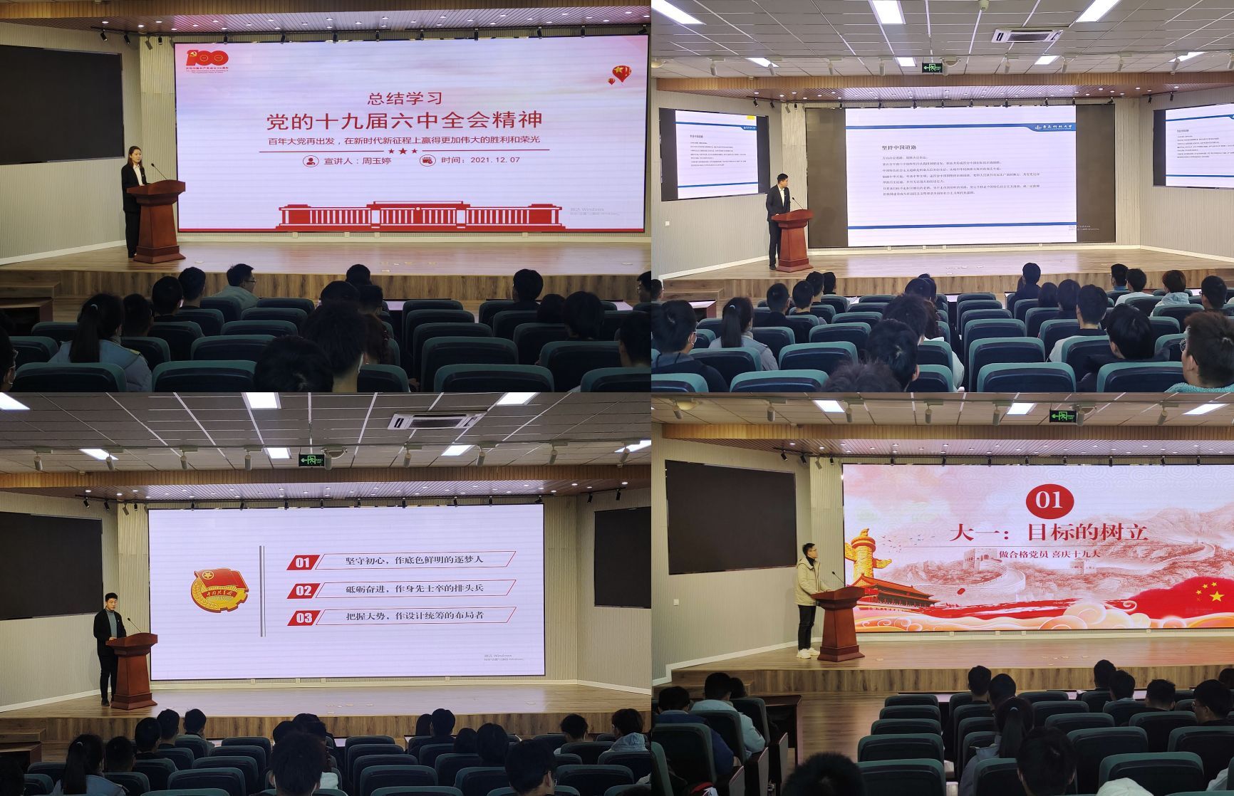学院党委高度重视学习贯彻党的十九届六中全会精神,在第一时间组织学习会议公报及《中共中央关于党的百年奋斗重大成就和历史经验的决议》,全面把握习近平总书记在全会上的重要讲话和全会精神的丰富内涵、精神实质,做到先学一步,深学一层,党委带头组织十九届六中全会精神的学习和宣讲,引导少数关键“核心力量”吃透全会精神,为“关键少数”带动“绝大多数”深研精学做好充分准备。