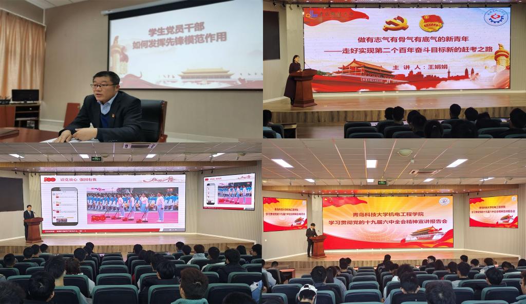 学院科学安排部署,依托“两社一团”阵地、“两员一心”平台,成立学院党的十九届六中全会精神宣讲团,以师生喜闻乐见的方式展开学习宣讲。机电学院党的十九届六中全会精神宣讲团以《勇担复兴大任,书写青春答卷》《宏伟蓝图鼓舞人心,奋勇前进凝聚力量》《做有志气、有骨气、有底气的新时代青年》等为主题,以“百年成就”“十大历史经验”为主线,带领青年学生深入学习贯彻党的十九届六中全会精神,各党支部开展“感悟全会精神,激发奋进力量”主题党日,在实践中入脑走实走深。