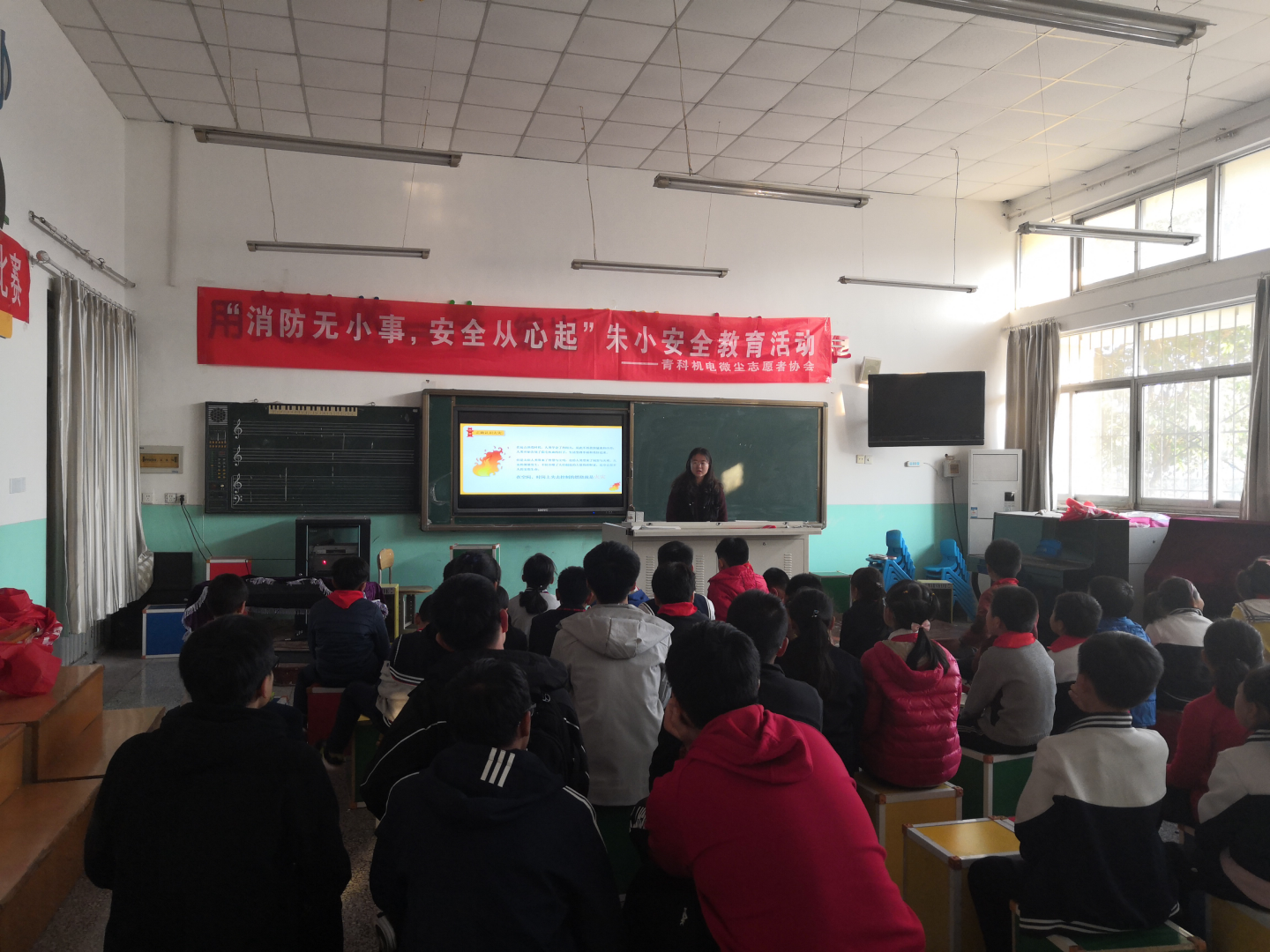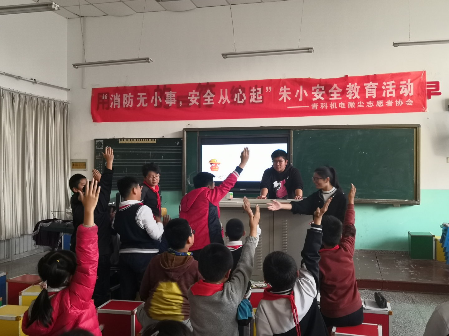 机电学院微尘志愿者协会于11月13日下午2:00走进朱家洼小学进行了安全教育活动。众所周知,11月9日是全国消防日。所以志愿者们趁此机会给孩子们讲述基本的防火安全常识和防范措施,带着他们认识一些消防设施。并与学生们进行互动交流,大大提高了小学生们的安全防患意识。更吸引人的是有奖问答环节,孩子们踊跃举手发言,与此同时,志愿者们准备了笔和本子等奖品来奖励那些积极发言的孩子。