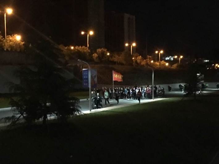 领跑者高举机电大旗在夜色中奔跑。在这60分钟内,同学们陶醉于这片安静的夜色,亲近本色的自然;在短暂的黑暗中回味静谧,反思自己的生活态度,珍惜当下。