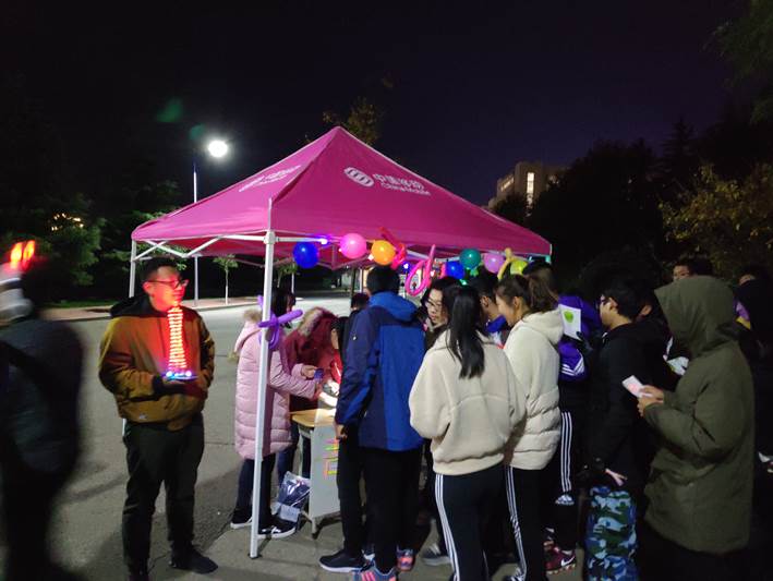 戴荧光饰品,手握荧光棒,把整个校园装点成一个荧光闪耀的欢乐海洋,涌动的人群在跑道上形成了一道道亮丽的风景线。