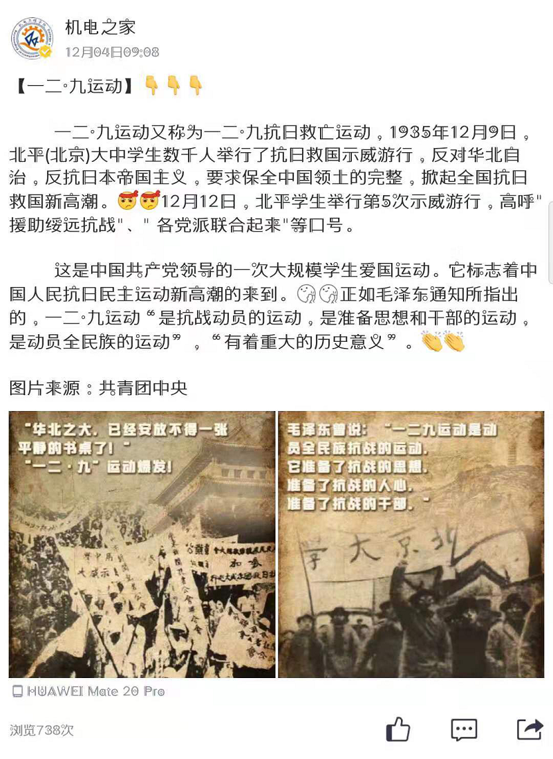 必赢线路检测3003no1面向全体2019级青年学生开展“纪念一二•九运动”爱国主题征文活动,征文活动发出后,受到广泛且热烈的追捧,经选拔,共计五篇优秀征文脱颖而出,在学院学生会自媒体平台“机电之家”公众号上推广展示。