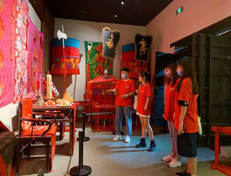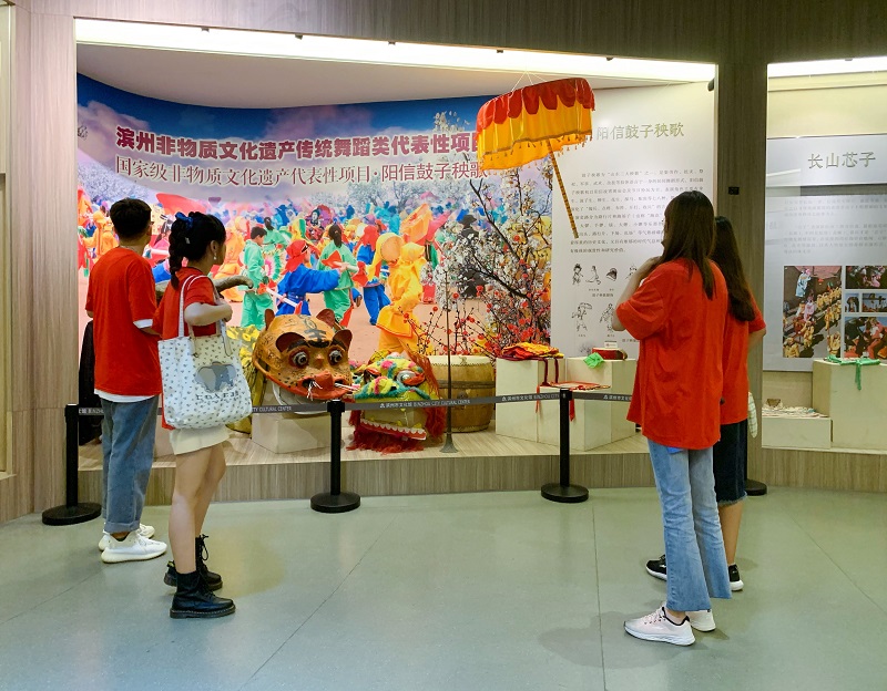 8月14日,调研团通过线上会议对此次实践活动进行了初步讨论,主要确定了开展线下实践调研活动的流程与细节,同时进一步熟悉滨州市非物质文化遗产的相关资料,探讨当地非物质文化遗产传承推广的实际情况。8月15日,参与生源地实践的4名队员来到滨州市文化馆的非物质文化遗产展馆参观。首先,队员们观看了展馆的介绍视频,该展馆共包括民间文学区、民间美术传统手工技艺区、传统表演艺术区、传承交流区、染织布艺区、草柳编结区和传统农具七个主题展区。随后,队员们跟随讲解员参观了滨州市文化馆非物质文化遗产展馆,在此过程中队员们也不忘学习记录、提出疑问,这使队员们对非物质文化遗产的历史文化及发展现状有了更进一步的了解。