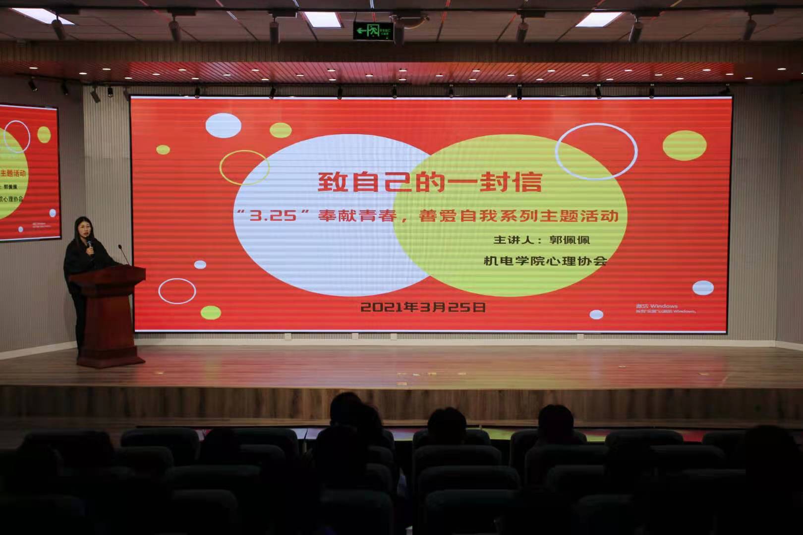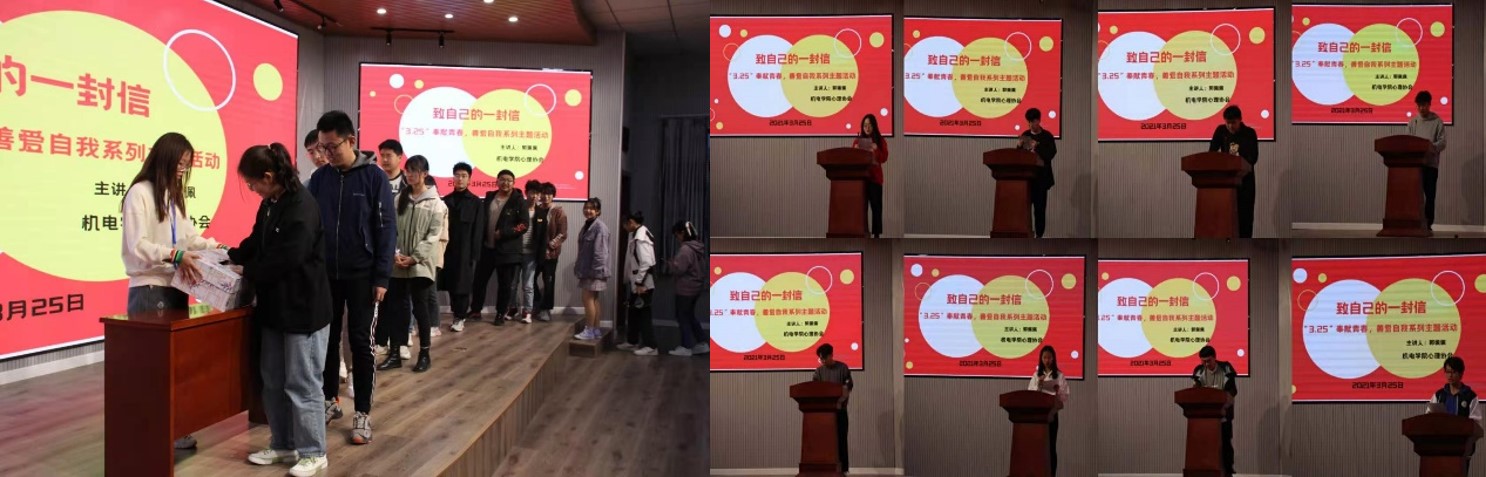 为增强大学生的心理自我调节能力,养成良好的心理品质,引导大学生善待自我,关爱他人,健康成长,促进学生全面协调发展。3月25日晚,机电学院开展了“致自己的一封信--3.25奉献青春,善爱自我”系列主题活动,会议由心理工作站站长郭佩佩老师主持。