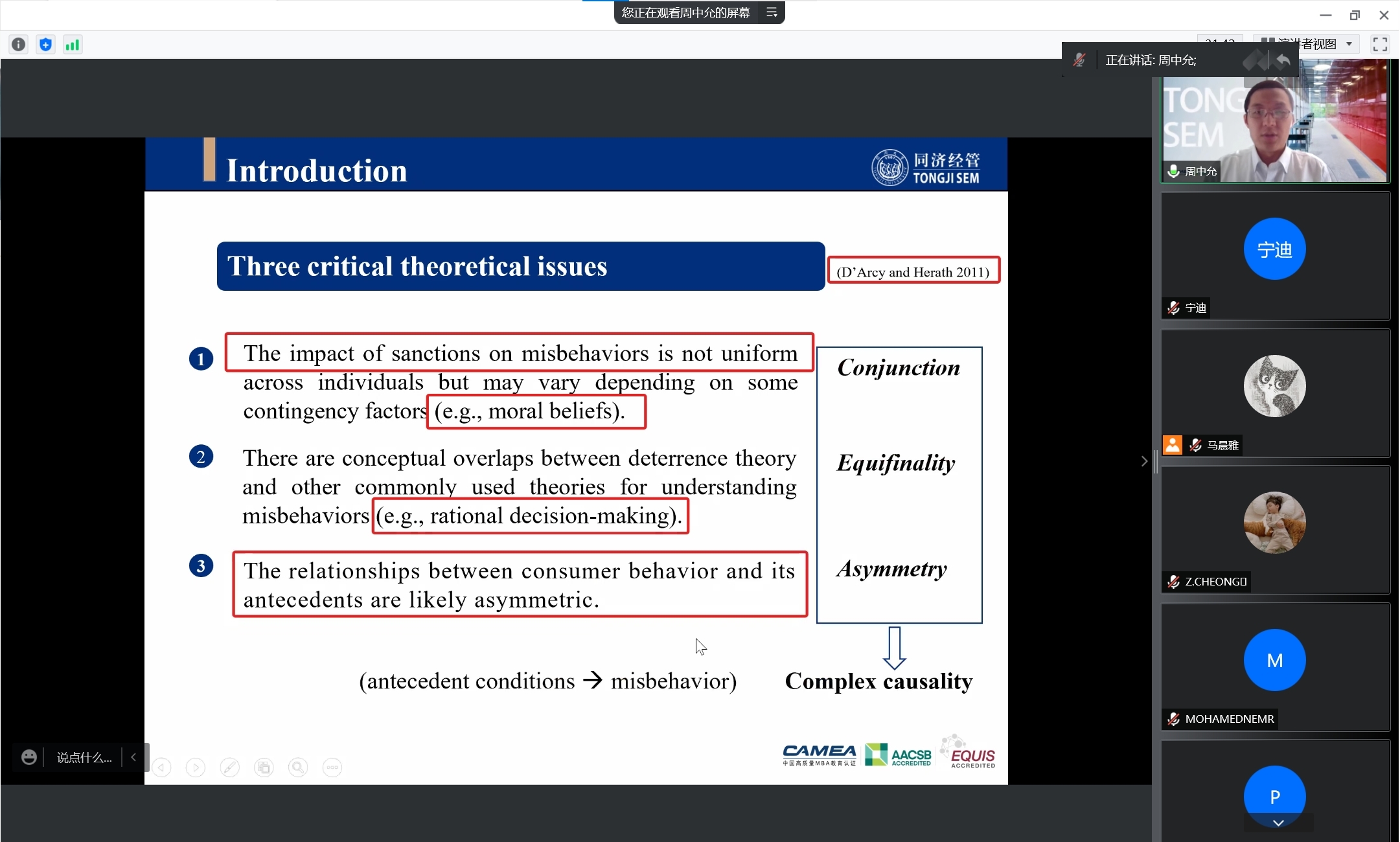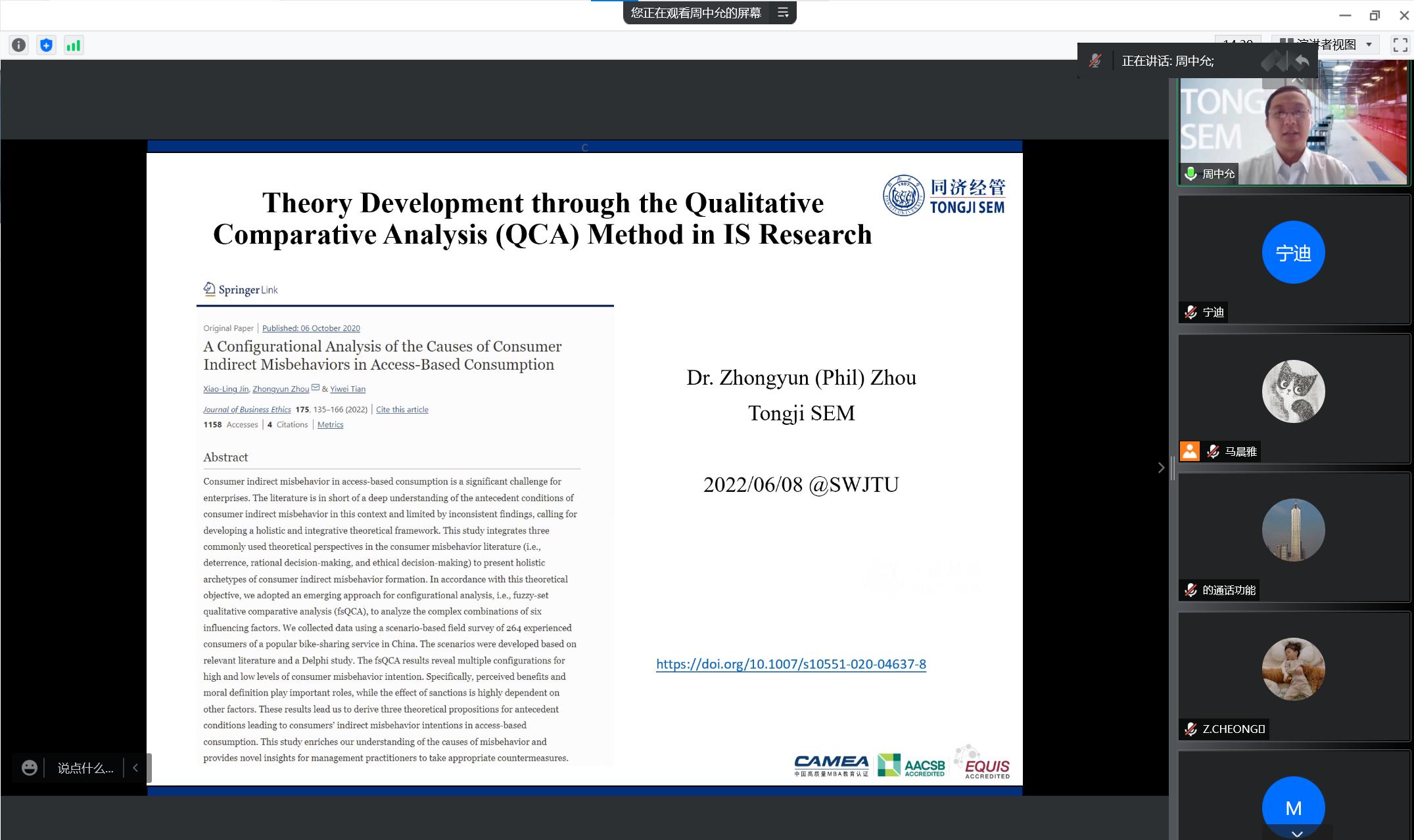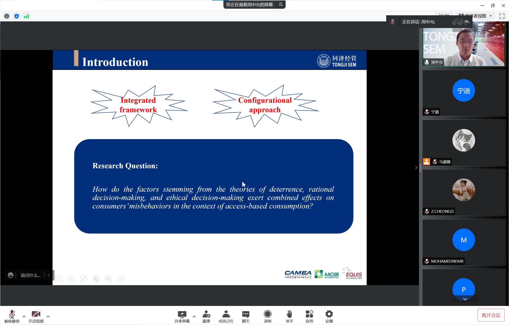 2022年6月8日下午1:30,同济大学经济与管理学院周中允副教授应邀为以“A Configurational Analysis of the Causes of Consumer Indirect Misbehaviors in Access-Based Consumption”为题为学院师生带来了一场精彩的学术分享,本次学术活动由学院市场学系蒋玉石教授主持,学院部分教师及30多名研究生参加了本次讲座。
